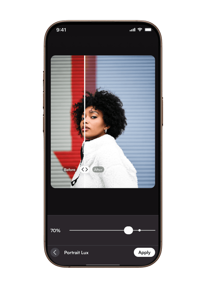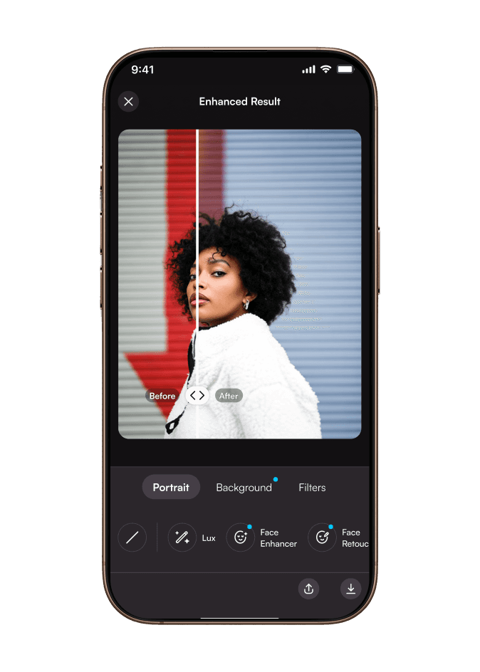 Users upload a photo, apply AI enhancements, and fine-tune with manual controls or filters. A preview mode shows changes in real-time.